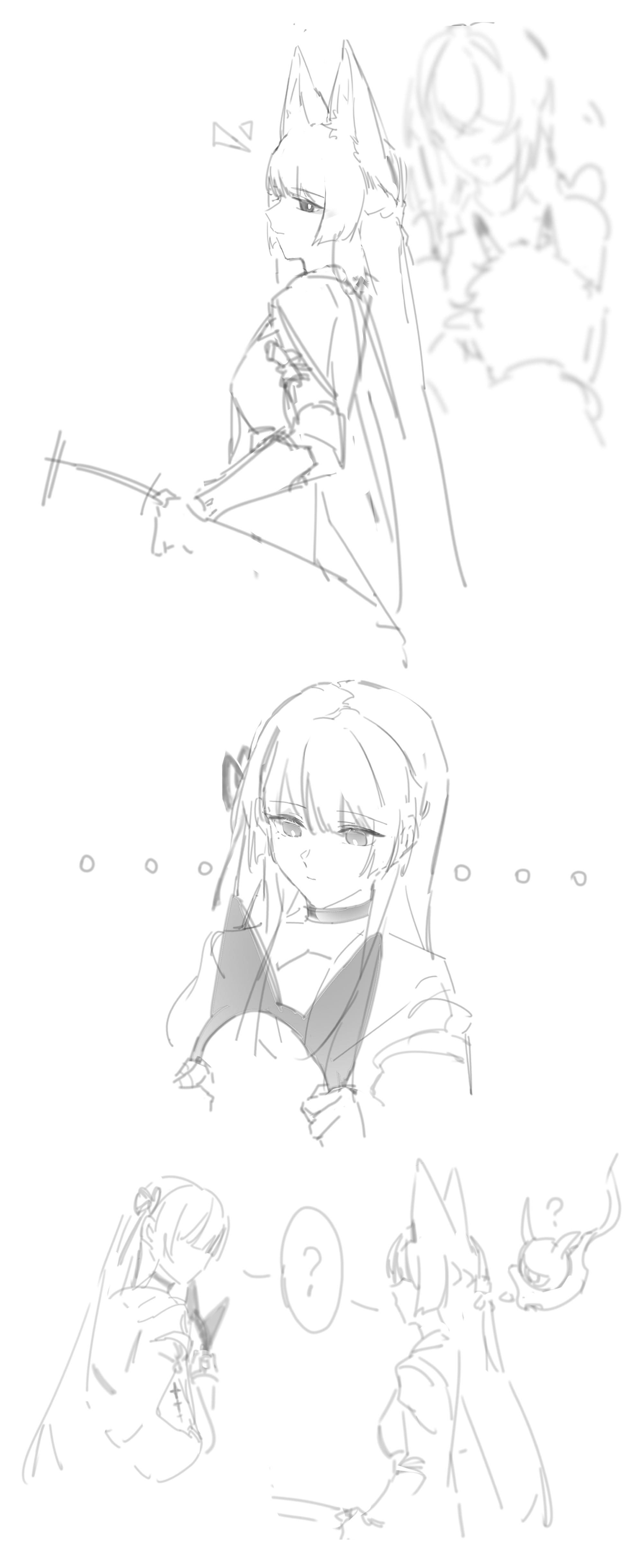1boy4girlsanimal ear hairbandanimal earsbraidbreastschokerclosed mouthcrossoverfake animal earsfox earsfox girlgreyscalehair ribbonhairbandhalf up braidholding hairbandlong hairmedium breastsmonochromemultiple girlsribbonsketchspoken question marktacet mark (wuthering waves)