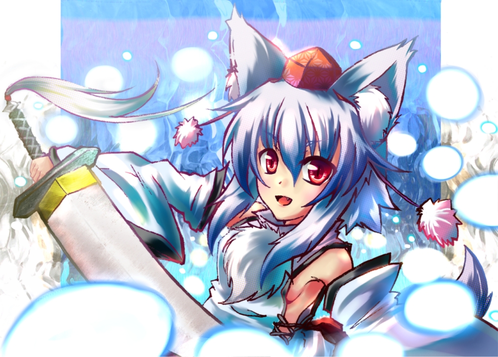 :d1girlanimal earsarmpitsbare shouldersblushdetached sleevesfemale focushatholdingholding swordholding weaponlooking at viewerno braopen mouthpom pom (clothes)smilesoloswordtaremetokin hatunsheathedweaponwolf ears
