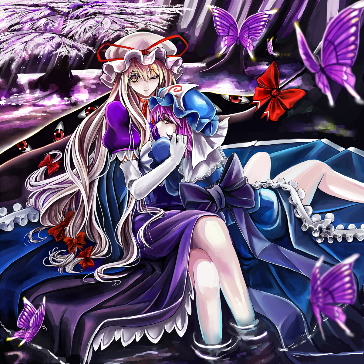 2girlsblonde hairblurrybugbutterflydepth of fieldelbow glovesfemale focusforeshorteninggap (touhou)gloveshair ribbonhathuginsectlong hairmultiple girlsone eye closedpink eyespink hairprofilepurple hairribbonshort hairsittingsoaking feettreevery long hairwaterwhite glovesyellow eyesyuri