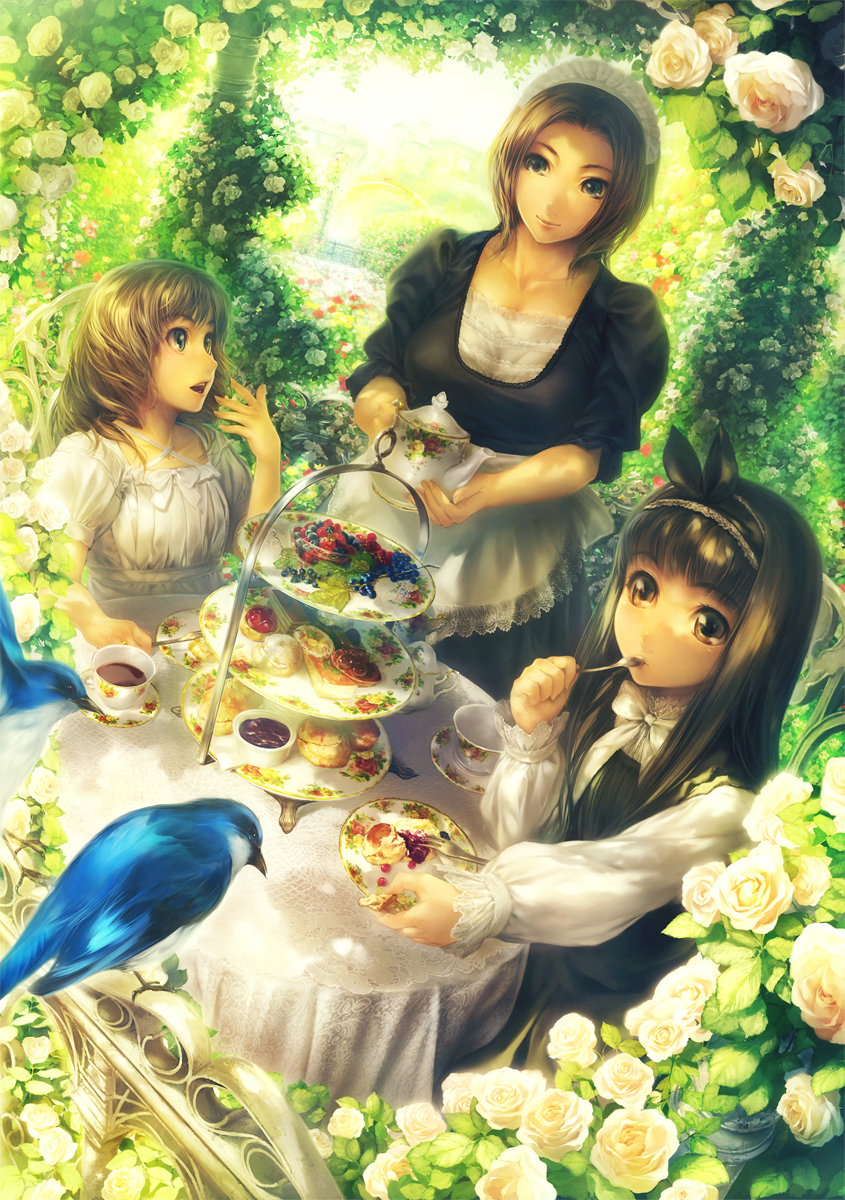 3girlsapronberrybirdbiscuit (bread)black dressblack hairblack ribbonblue eyesblueberryblunt bangsbowbrown hairbushchaircollarbonecupdresseatingeyelashesfeedingflowerfoodforkformal clothesfruitgardenhair ribbonhand to own mouthholdingholding foodholding forkholding spoonjamlacelong hairlong sleeveslooking at anothermaidmaid apronmaid headdressmultiple girlsopen mouthoutdoorsoutstretched armplantpuffy short sleevespuffy sleevesribbonrosesaucershort hairshort sleevesslice of lifesmilespoonstandingstrawberrysunlighttabletableclothteacupteapottiered trayutensil in mouthwaist apronwhite bowwhite dressyellow floweryellow rose