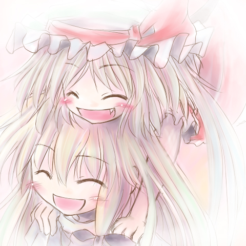 :d1boy2girlsblonde hairblushclosed eyesfangfemale focushatlong hairmob capmultiple girlsopen mouthsimple backgroundsmileupper bodywhite background