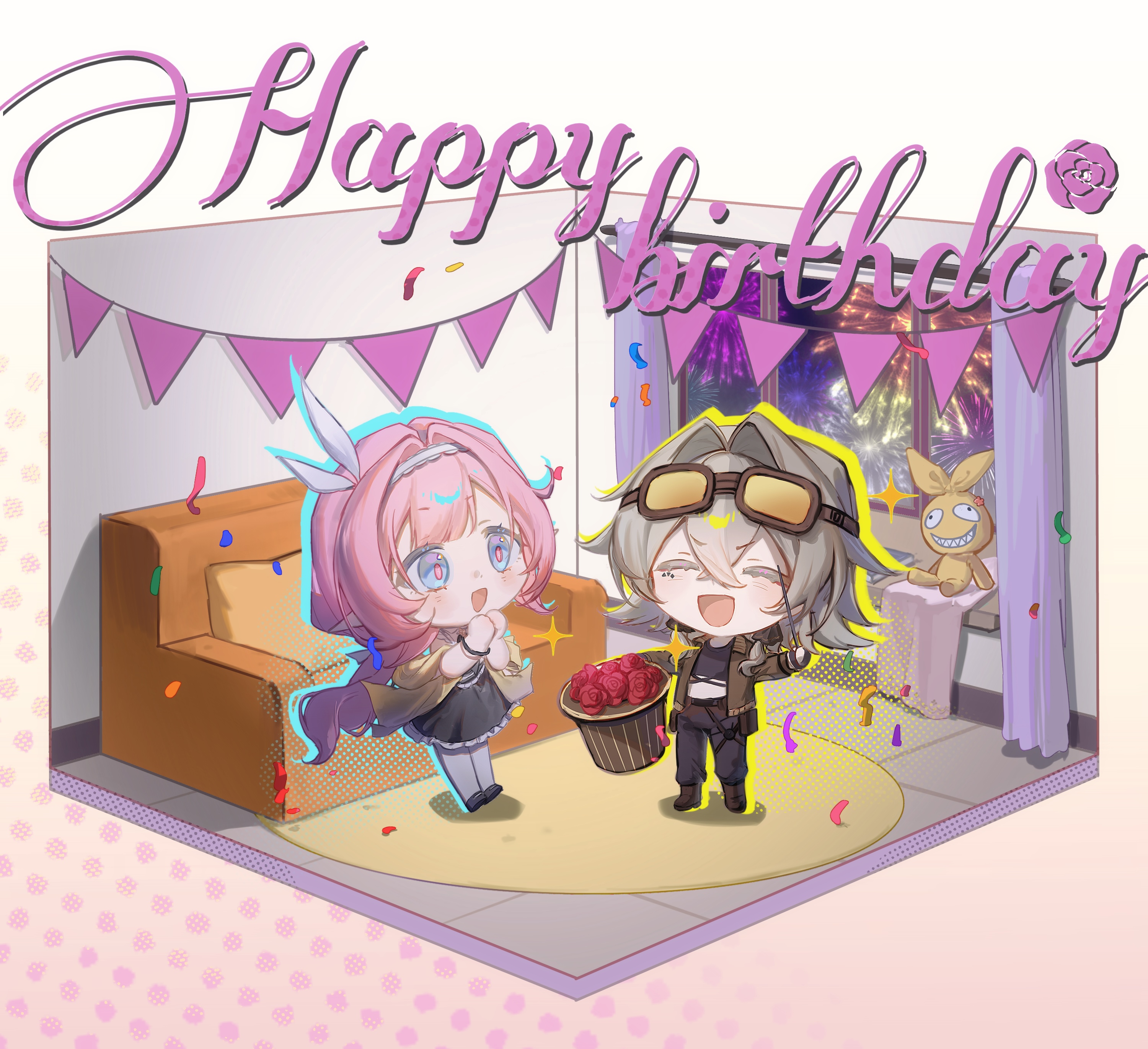 2girlsaerial fireworksblack pantsblue dressbrown hairbrown jacketchibichibi onlyclosed eyescouchcrop topdressfireworksgogglesgoggles on headhairbandhappy birthdayhatindoorsjacketlong hairlooking at anothermedium hairmultiple girlsofficial alternate costumeopen mouthpantspink hairstar (symbol)stuffed toytop hatwhite hairband