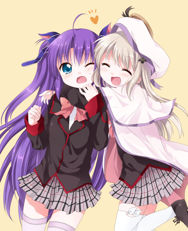 2girlsblue eyesbowclosed eyesfanghathuglong hairmultiple girlsone eye closedpink bowplaid clothesplaid skirtpurple hairschool uniformsimple backgroundskirttwintailswink