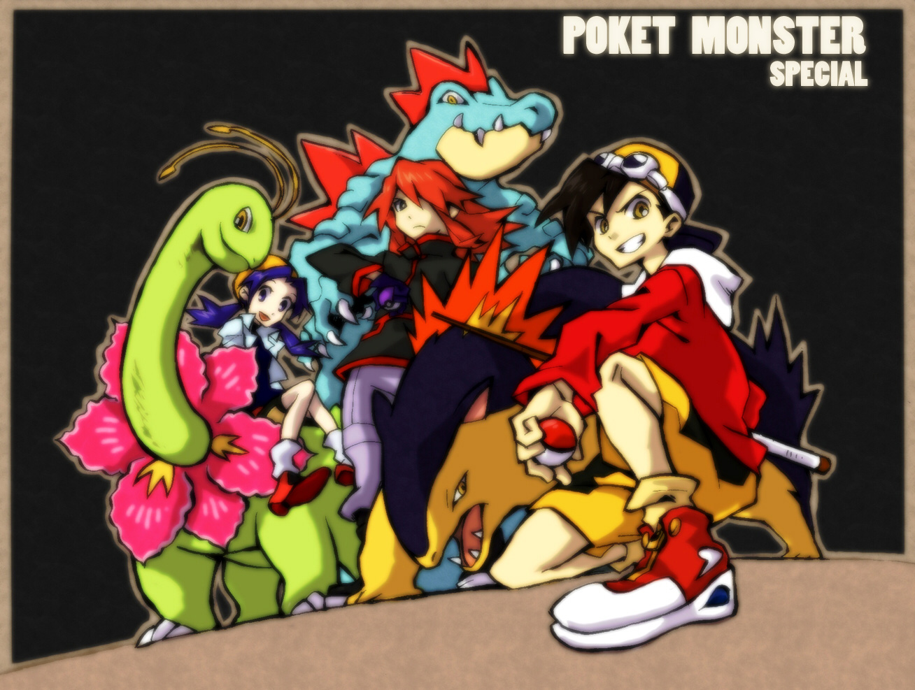 1girl2boysbaseball capblack hairblue eyesblue haircue stickgen 2 pokemonglovesgogglesgrinhair over one eyehatholdingholding poke balllong hairmultiple boysopen mouthpoke ballpokemon (creature)red hairsmilestarter pokemon triotwintailsyellow eyes