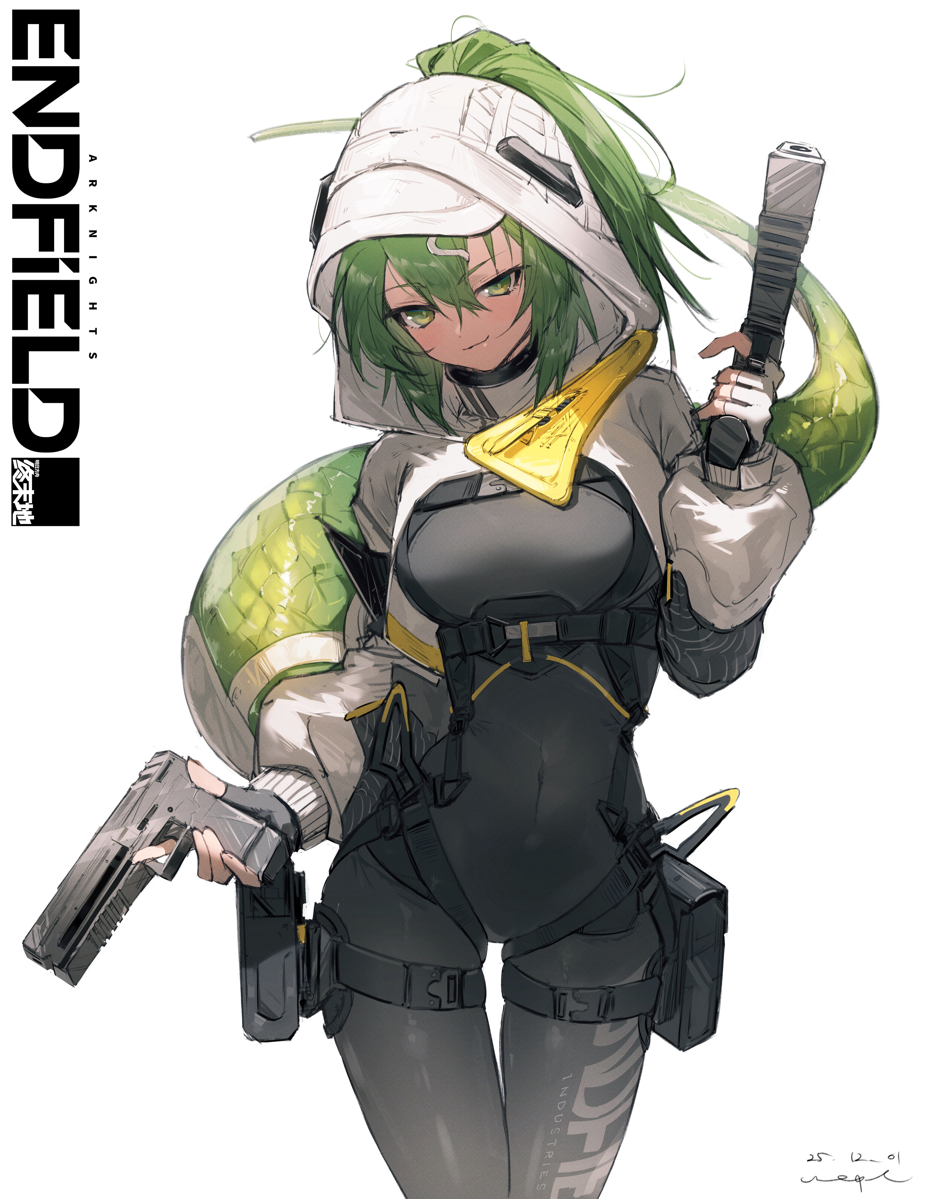 1girlblack bodysuitblack glovesbodysuitbreastsclosed mouthcopyright namecovered naveldateddual wieldingfingerless glovesglovesgreen eyesgreen hairgunhair ornamenthair through hoodhairclipholdingholding gunholding weaponhoodhood uphooded shruglong hairlong sleeveslooking at viewermedium breastsponytailpouchpuffy long sleevespuffy sleevesscalesshrug (clothing)signaturesimple backgroundsmilesnake tailsolotailthigh gapthigh pouchthigh strapweaponwhite background