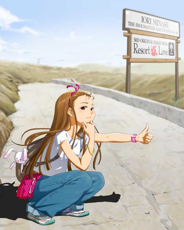 00s1girlbackpackbagbraceletbrown eyesbrown haircharacter namedenimfemale focushair ribbonhairbandhitchhikingjeansjewelrylong hairpantsribbonroadshoessneakerssolosquattingstuffed animalstuffed rabbitstuffed toythumbs upwatchwristwatch