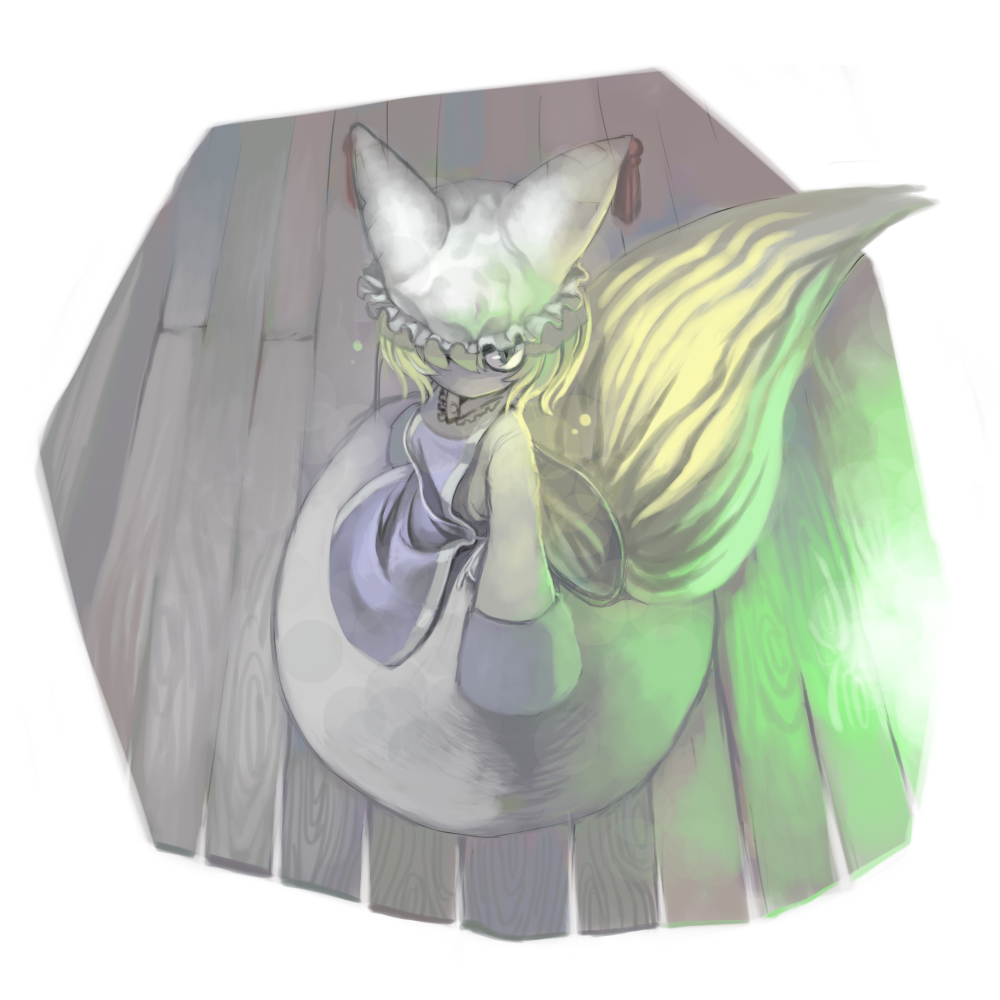 1girlaged downanimal hatblonde hairfemale focusfox tailhair over one eyehatlong sleeveslooking upmob capno mouthshort hairslit pupilssolotabardtailtasselwide sleeveswooden flooryellow eyes