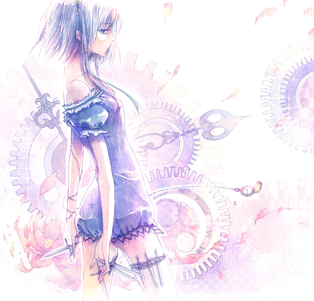 1girlalternate costumebare shoulderschainclockfemale focusflowergearsgridhairbandknifelingeriepocket watchshort hairsolothigh strapunderwearwatch