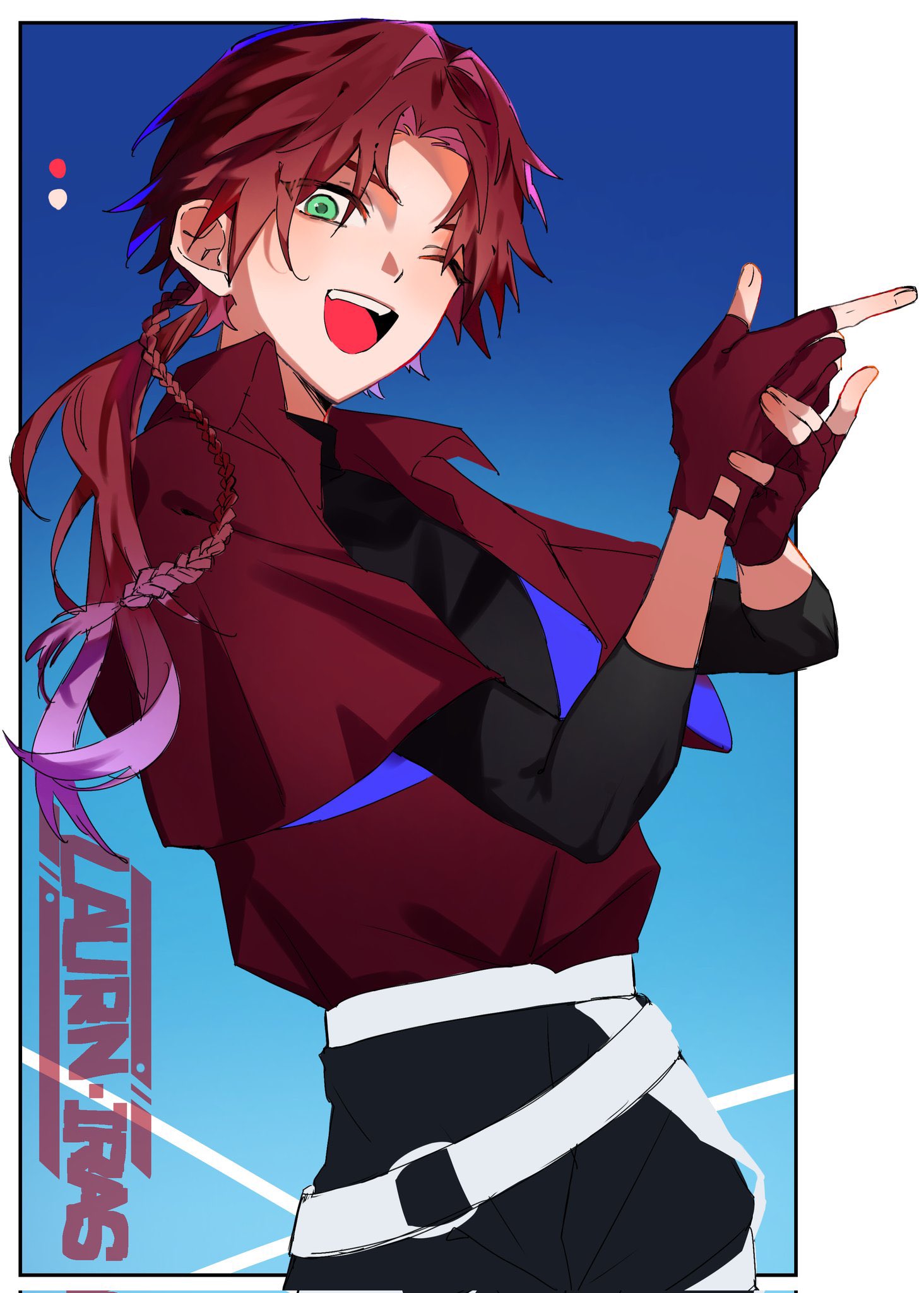 1boyalternate costumebeltblack shirtborderbraidcharacter namecowboy shotfinger gunfingerless glovesglovesgradient hairgreen eyeshair intakeshands upkmrmstnlong hairlong sleeveslooking at viewermulticolored hairone eye closedopen mouthparted bangsponytailred glovesred hairred shirtshirtsingle braidsmilesoloteethtongueupper teeth onlyvirtual youtuberwhite beltwhite border