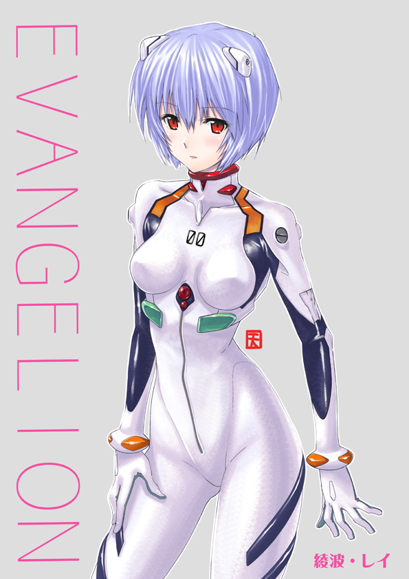 :d1girlblue hairblushbodysuitbracercharacter namecopyright namecowboy shotfemale focusglovesgrey backgroundhair between eyeshair ornamenthand on own thighlegs apartmecha pilot suitopen mouthoutlineplugsuit (evangelion)red eyesshort hairsignaturesimple backgroundskinnysmilesoloturtleneck