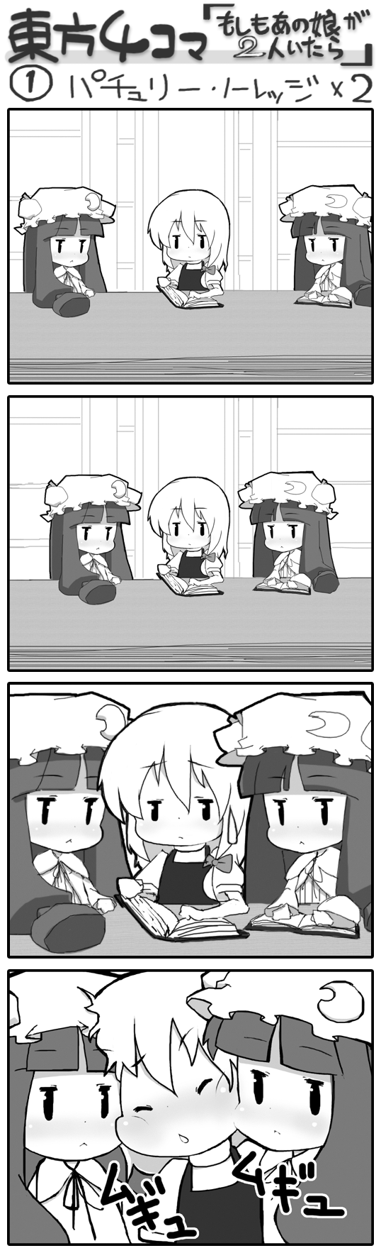 3girls4komablushbookchibiclonecomicfemale focusgreyscalehatlong hairmonochromemukyuumultiple girlsribbon