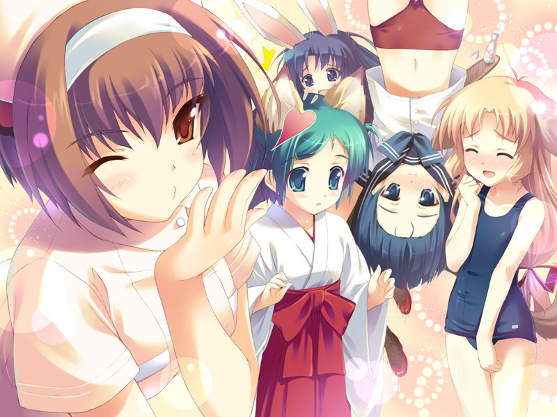 5girlsalcoholanimal earsblonde hairblowing kissblue eyesblue hairblushbrown hairburumachoko (cup)closed eyescosplaycupgreen eyesgreen hairhairbandjapanese clotheslaughinglong hairmidriffmikomultiple girlsnavelnurseone eye closedone-piece swimsuitopen mouthrabbit earsred eyessakeschool swimsuitshort hairswimsuittailtokkuriupside-downwink