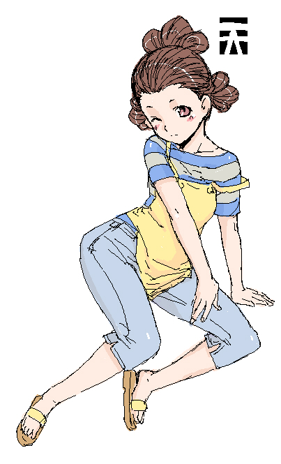 1girlapronblushbrown hairdenimfemale focusjeansoekakione eye closedpantssandalsshort hairsimple backgroundsittingsolowhite backgroundwinkyokozuwari
