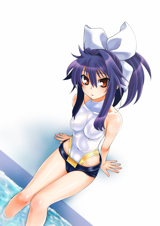 1girlbare shouldersblushbodysuitbreastsbrown eyesfemale focusfrom abovehair ribbonlegslong hairone-piece swimsuitponytailpoolpurple hairribbonshortssittingsoloswimsuitwater