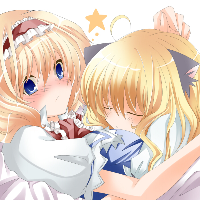 2girlsahogeanimal earsblonde hairblue eyesblushcat earscat girlfemale focusmultiple girlssleeping
