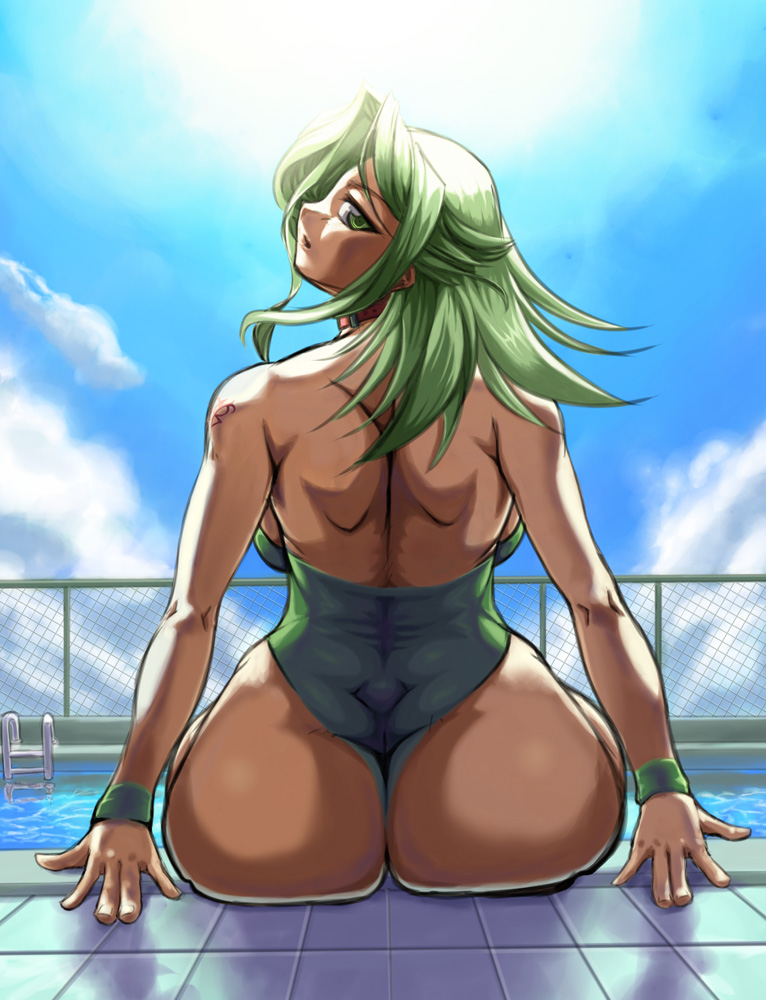 1girlandroidassbackbackboobbreastsfemale focusgreen hairhip focushuge asshuge breastslooking backpoolsittingsolowide hips