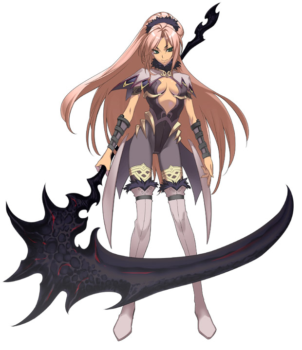 1girlarmbandbodysuitbootsbreastscapeletcenter openingcleavagedetached sleevesfemale focusfull bodyfur trimgreen eyeshuge weaponlong hairno brapink hairponytailscrunchiescythesimple backgroundsmilesolostandingthigh bootsthighhighsturtleneckvery long hairweaponwhite backgroundwhite thighhighs