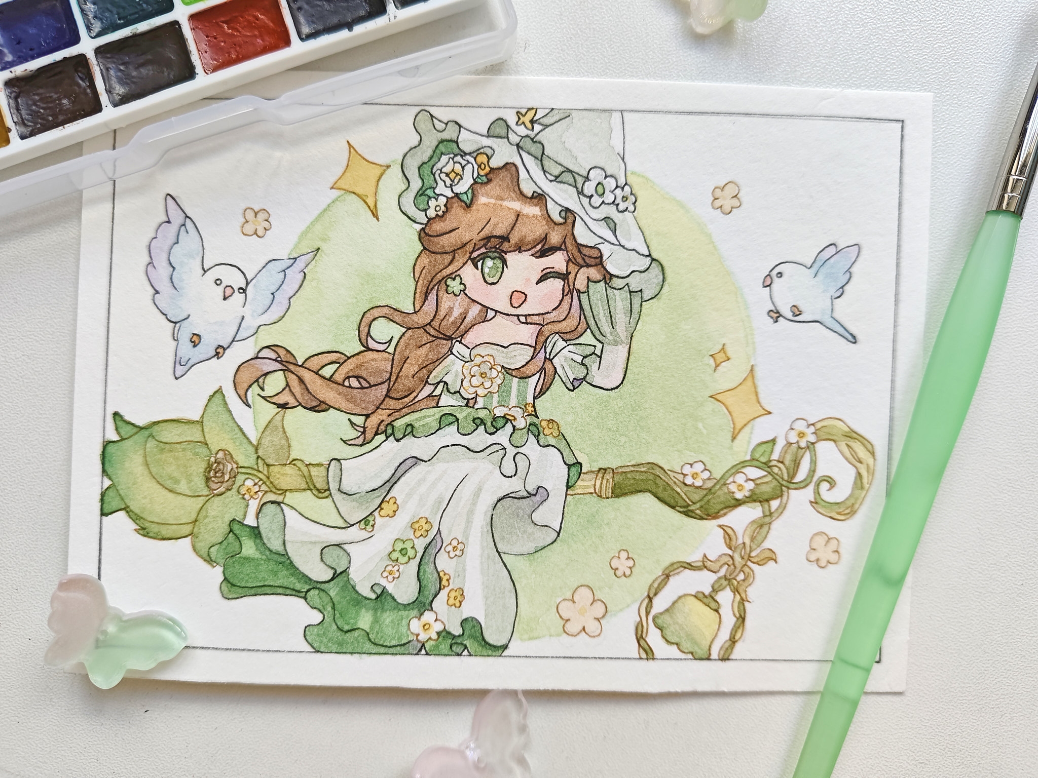 1girlanimalart tools in framebare shouldersbirdbroombroom ridingbrown hairbutterfly hat ornamentchibicircledressdress flowerearringsfloating clothesfloating hairflowerflower earringsfrilled dressfrillsgreen backgroundgreen dressgreen eyesgreen flowergreen hathair flowerhair ornamenthand in own hairhappyhathat flowerhat ornamentjewelrylanternlayered sleeveslight blushlong dresslong hairlong sleeveslooking aheadlow twintailsoff shoulderoff-shoulder dressone eye closedopen mouthpleated sleevesqianniaosikongrainfall & blossoms (infinity nikki)short over long sleevesshort sleevessidelockssleeves past wristssmilesolosparklestriped clothesstriped dresstwintailstwo-tone backgroundvertical-striped clothesvertical-striped dressvery long hairwavy hairwhite backgroundwhite flowerwitchwitch hatyellow flower