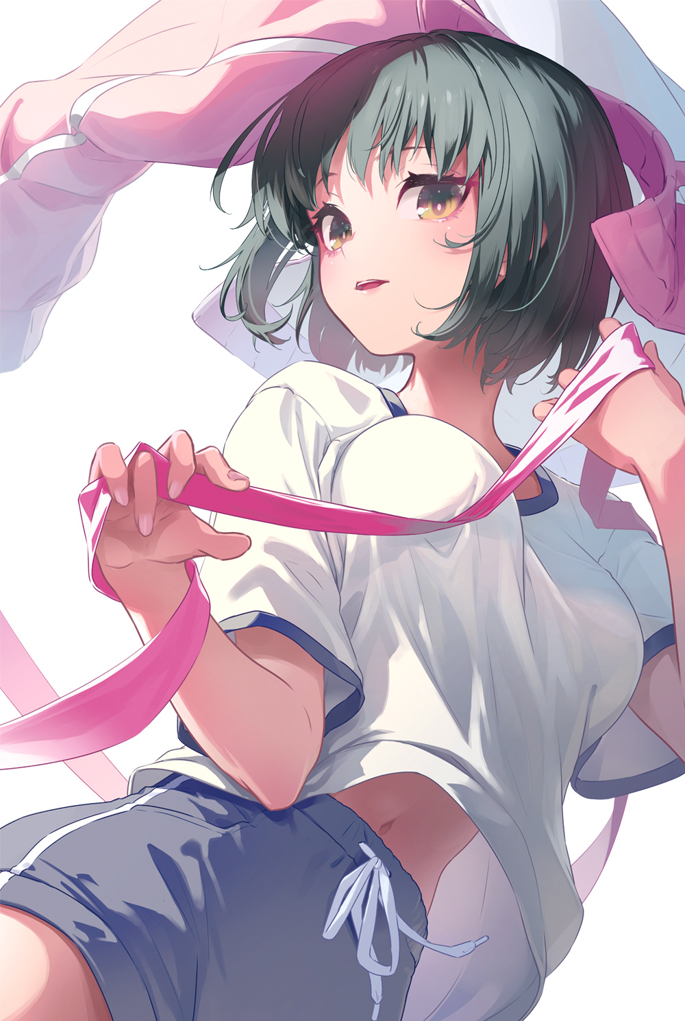 1girlblack hairblack shortsblushbouncing breastsbreastsbrown haircovercover pagefemale focusholdingholding ribbonjacketlarge breastslong sleeveslooking at viewermedium hairmidriffnavelno braopen mouthpink jacketpink ribbonribbonsexually suggestiveshirtshort hairshortssimple backgroundsolosolo focusstomachteethupper teeth onlywhite backgroundwhite shirt