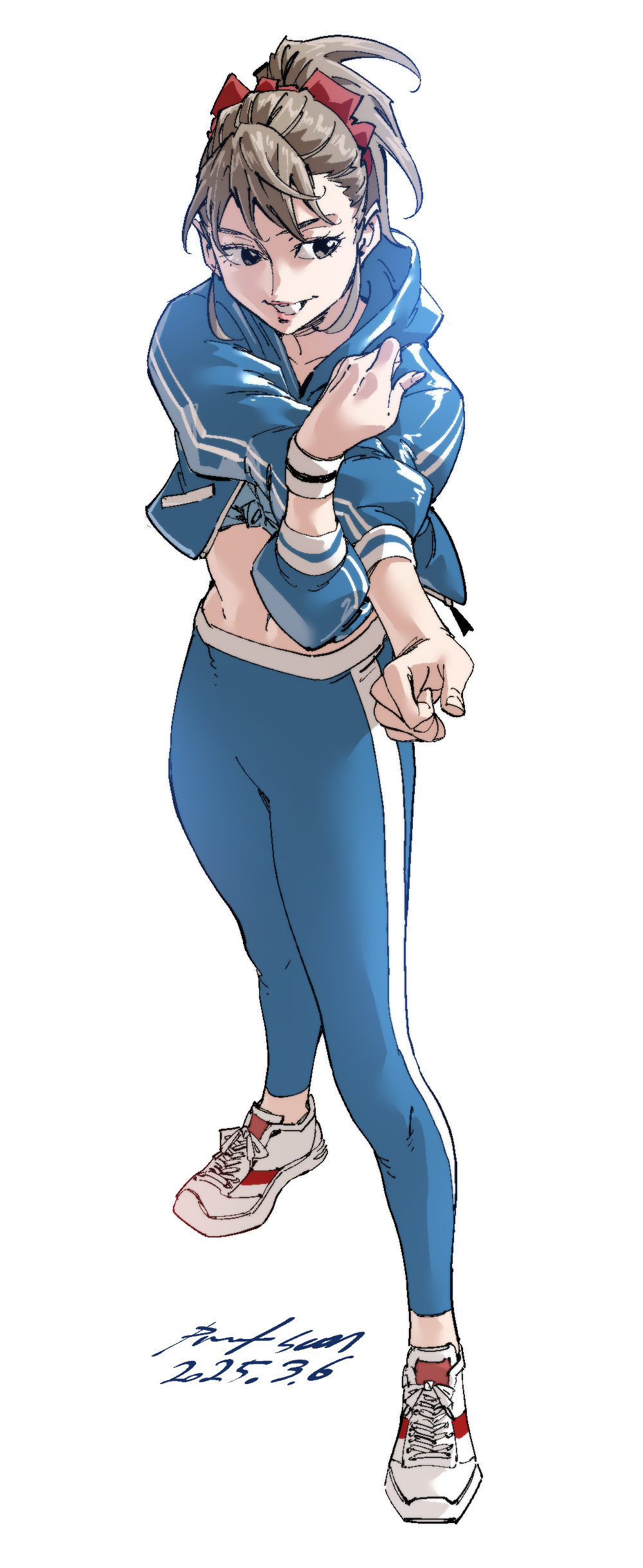 1girlbrown eyesbrown hairfull bodyjacketnavelopen clothesopen jacketpantsponytailshirtshoessmilesneakerssolostretchingtied shirttrack pants