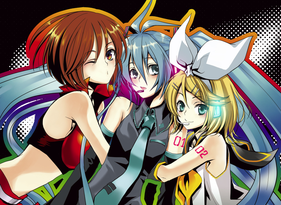 3girlsaqua eyesaqua hairblonde hairblue eyesbrown eyesbrown hairdetached sleeveshair ornamenthair ribbonhairclipheadphonesheadsetlong hairmidriffmultiple girlsnecktieone eye closedribbonshort hairskirtsmiletwintailswink