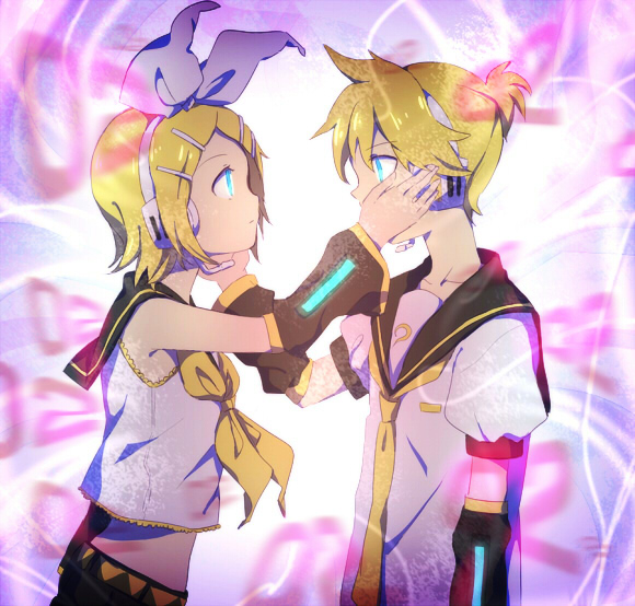 1boy1girlblonde hairblue eyesbrother and sisterdetached sleevesglowingglowing eyeshair ornamenthair ribbonhairclipheadphonesheadsetmidriffnecktieribbonshort hairsiblingstwinsyellow necktie