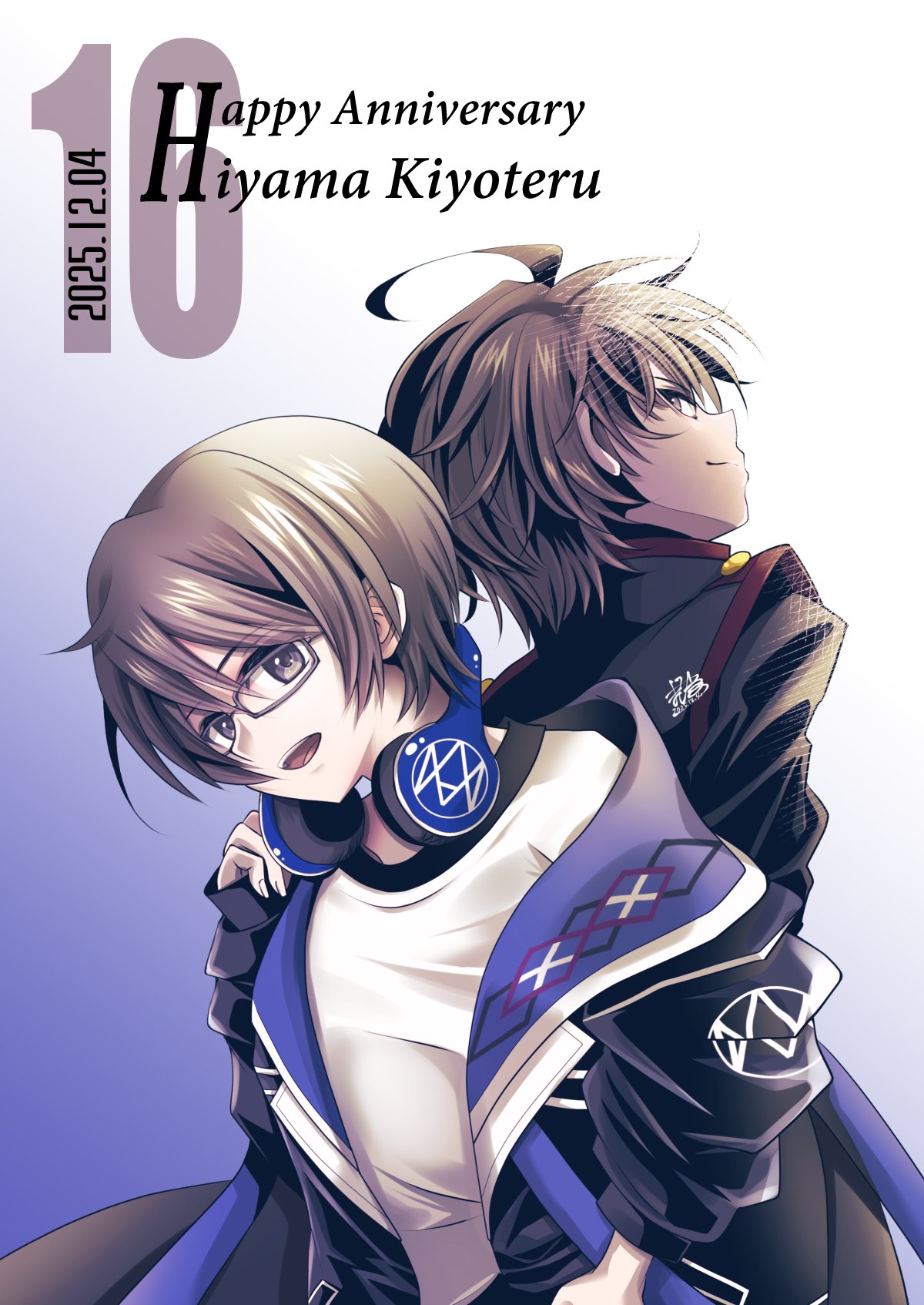 :d2boysahogeblack hairblack jacketcharacter nameclosed mouthdateddual personaglassesgradient backgroundgrey eyeshappy birthdayheadphonesheadphones around neckjacketmale focusmultiple boysopen clothesopen jacketopen mouthshirtsignaturesmileteethupper teeth onlywhite shirt