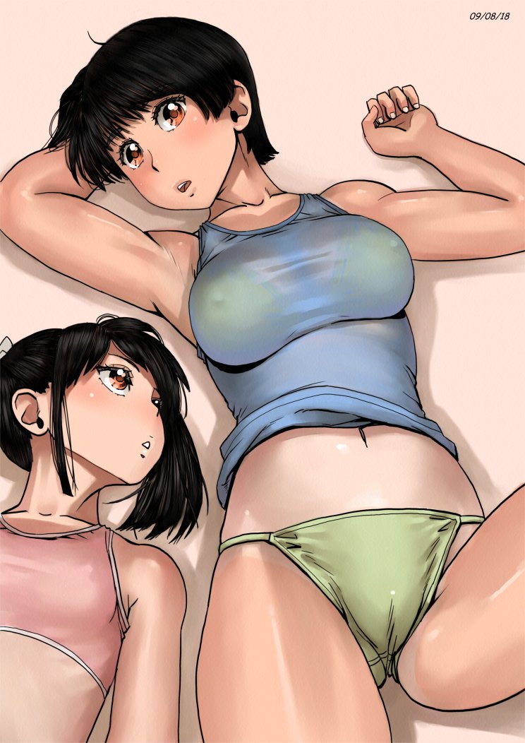 2girlsarmpitsbikinibikini under clothesblack hairblushbreast awebreast envybreastscameltoeclothes liftcovered erect nipplesdatedflat chestgreen bikinilarge breastslooking at anotherlooking at viewerlyingmidriffmultiple girlsnavelon backone-piece tanorange eyesparted lipspink backgroundribssee-through clothesshirt liftshort hairsimple backgroundswimsuitswimsuit under clothestantank toptanlinetaut clothestwintails