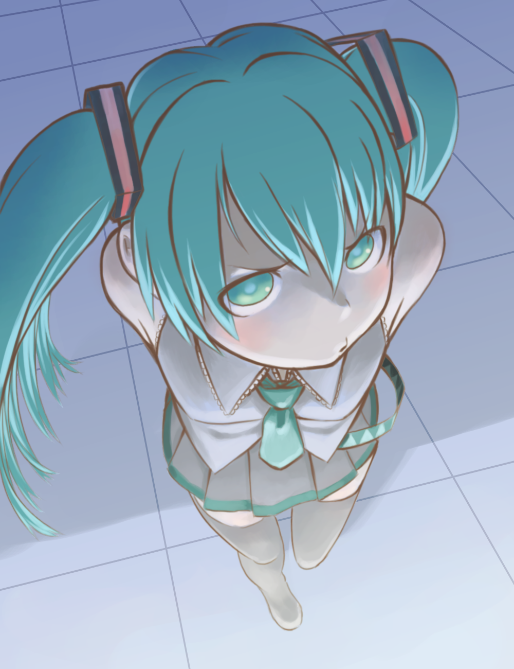 1boy1girlangryaqua eyesaqua hairfemale focusforeshorteningfrom abovelong hairnecktiepoutskirtsolothighhighstwintailszettai ryouiki