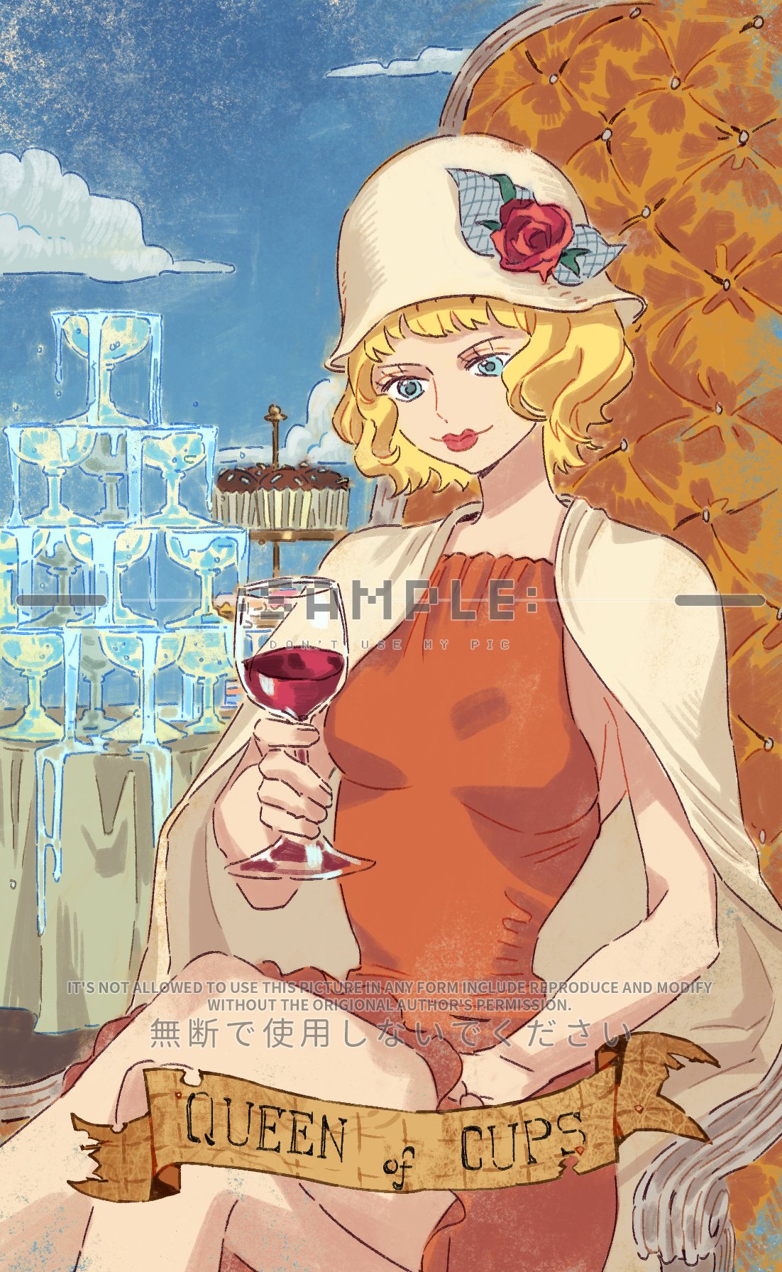 1girlblonde hairblue eyesblue skycapecard (medium)cloudcrossed legscupdresseyelasheshatholdingholding cuporange dressroman numeralsample watermarkshort hairsittingskysleevelesssleeveless dresssmilesolotarottarot (medium)watermark