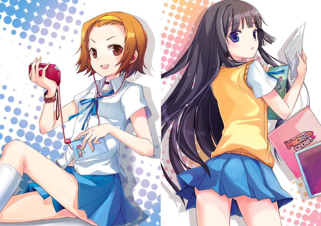 00s2girlsblack hairblue eyesbrown eyesbrown hairearbudsearphonesfolderhairbandhandheld game consoleheadphoneslong hairlooking backmultiple girlsplaystation portableschool uniformsheet musicskirt