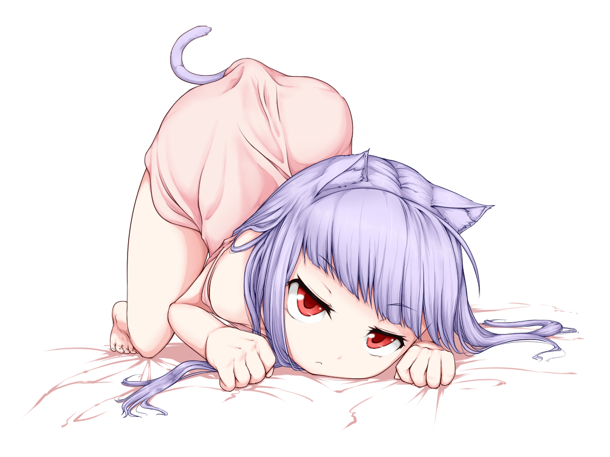 1girlanimal earsbarefootcat earscat girlcat tailclosed mouthdressfull bodykemonomimi modelong hairlooking at viewerpink dresspurple hairred eyessimple backgroundsleevelesssleeveless dresssolotailtop-down bottom-upwhite background