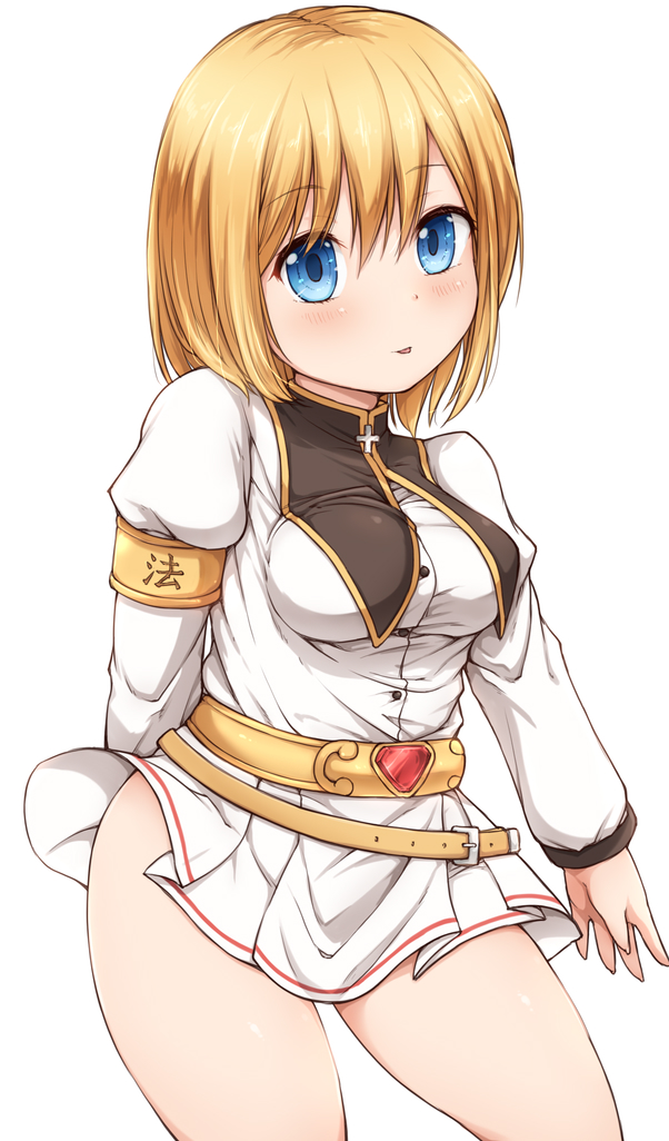 1girlarmbandbeltblonde hairblue eyesblushbreastsclosed mouthcontrast collarcowboy shotdressgame master (ragnarok online)long sleeveslooking at viewermedium breastsshirt beltshort hairsimple backgroundsmilesolotonguetongue outwhite backgroundwhite dressyellow belt