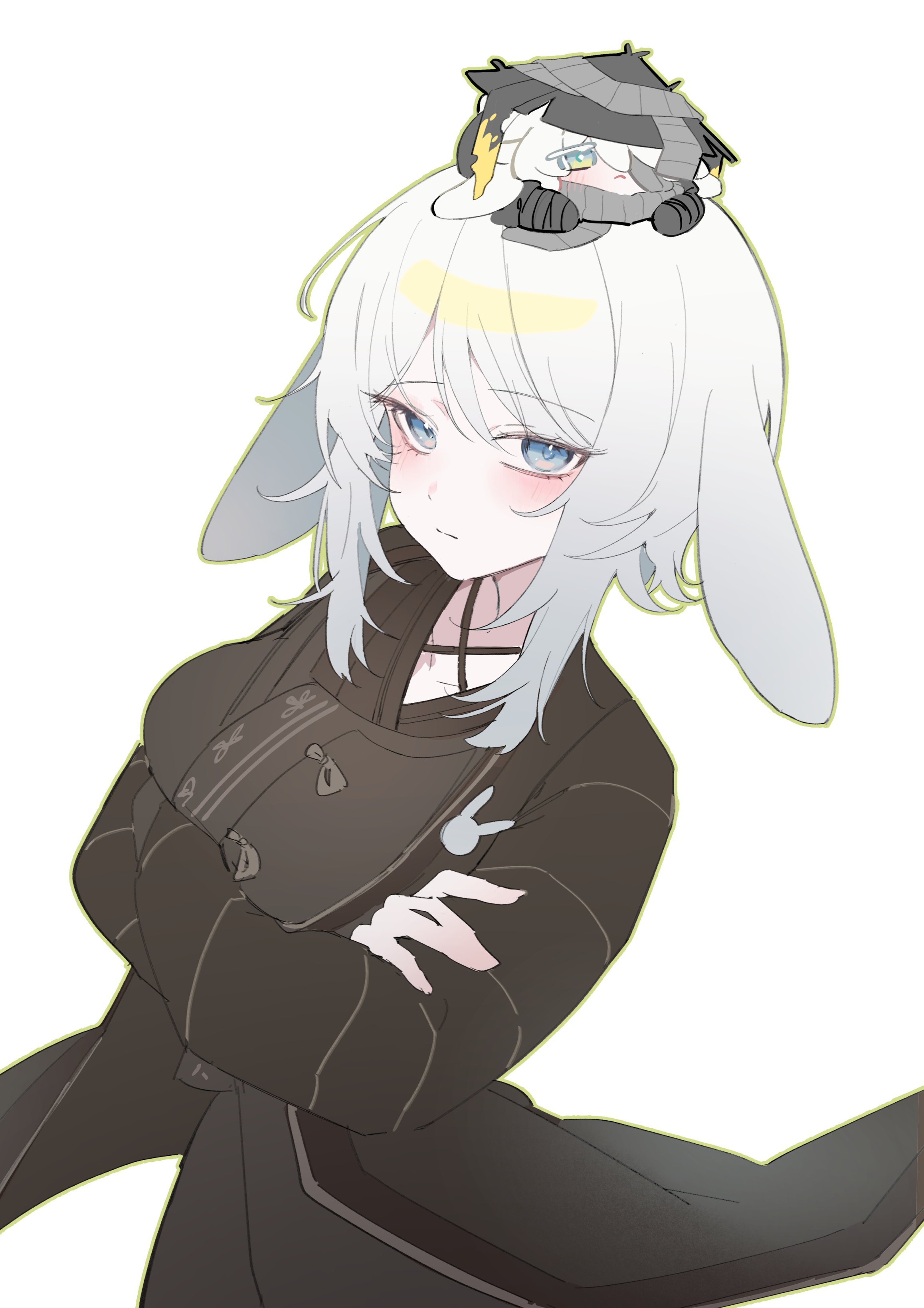 1girlanimal earsblue eyesbrown jacketcrossed armsgrey hairjacketlooking at viewerrabbit earsrabbit girlsimple backgroundsolowhite background