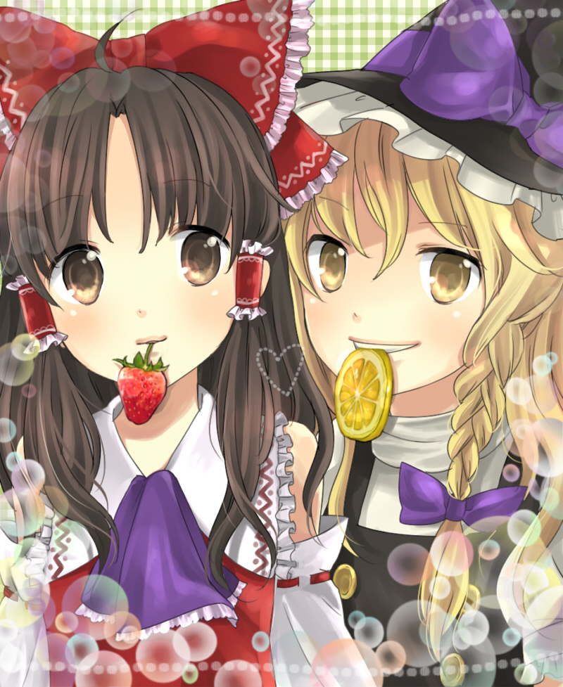 2girlsblonde hairbowbraidbrown eyesbrown hairdetached sleevesfemale focusfoodfruithatjapanese clotheslemonlemon slicemikomouth holdmultiple girlsshort hairstrawberrywitchwitch hatyellow eyes