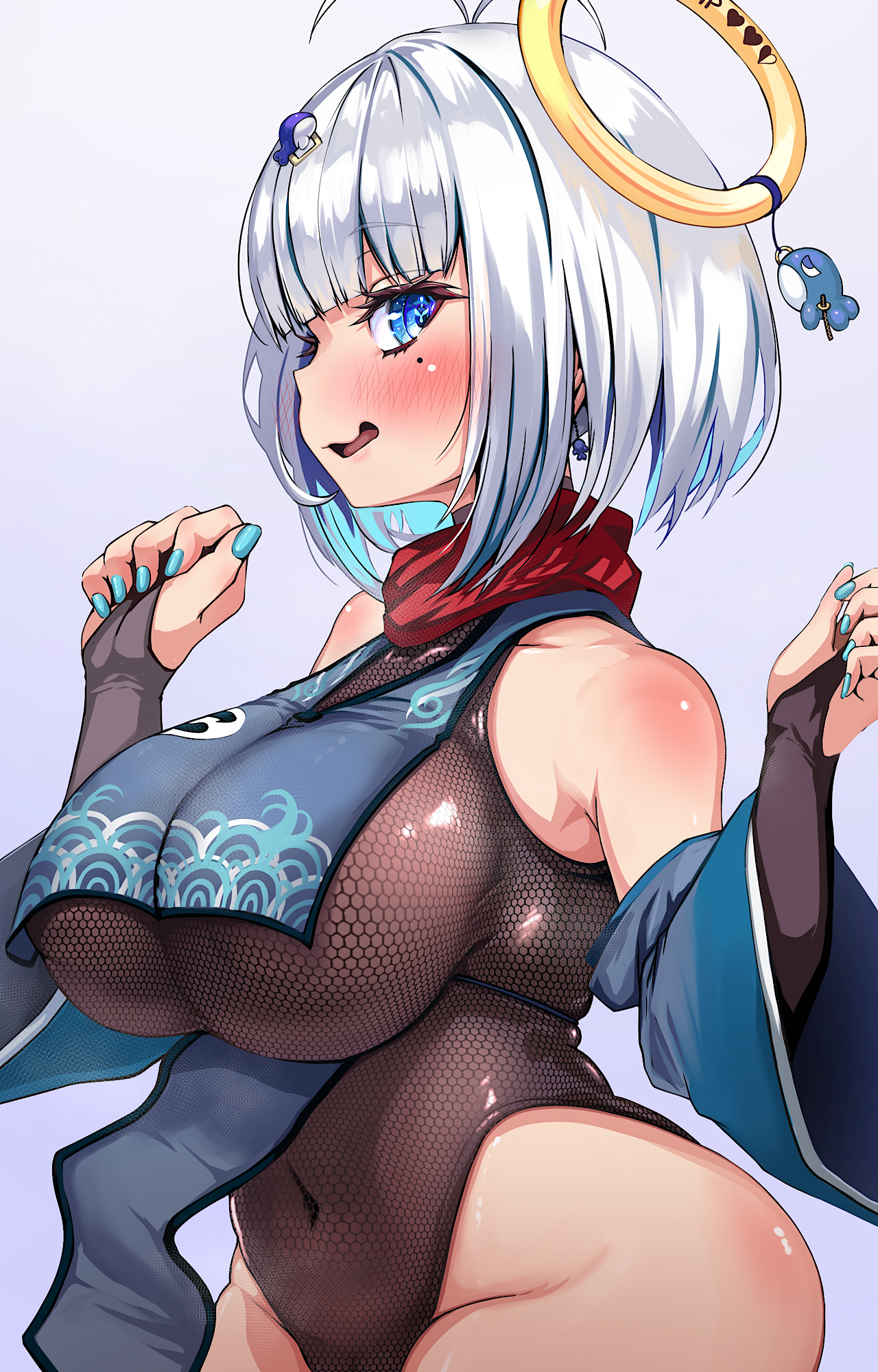 1girlanimal earringsantenna hairblue eyesblue nailsbreast curtainbreastscovered erect nipplescovered navelfingerless glovesfishnet leotardfishnetsfrom sideglovesgrey hairhair ornamenthalo ornamenthealth barlarge breastsleotardlooking at viewermolemole under eyemulticolored hairninjaopen mouthred scarfscarfsideboobsymbol-shaped pupilsvirtual youtuberwhale hair ornamentwhite hair