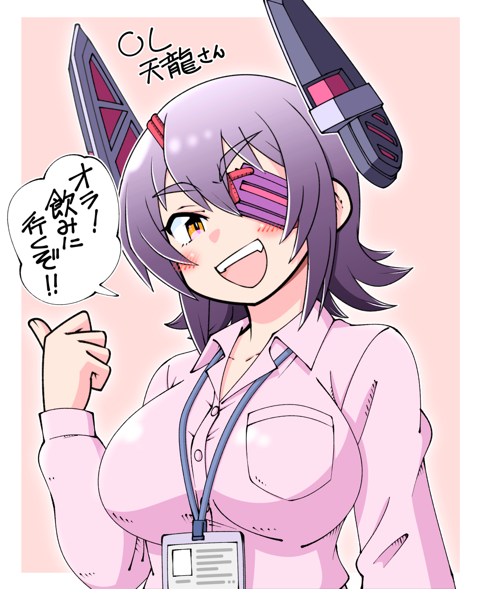 1girlbreast pocketbreastscollared shirtdress shirteyepatchheadgearid cardlanyardlarge breastsopen mouthpink backgroundpink shirtpocketpurple hairshirtshort hairsimple backgroundsmilesoloteethupper teeth onlyyellow eyes
