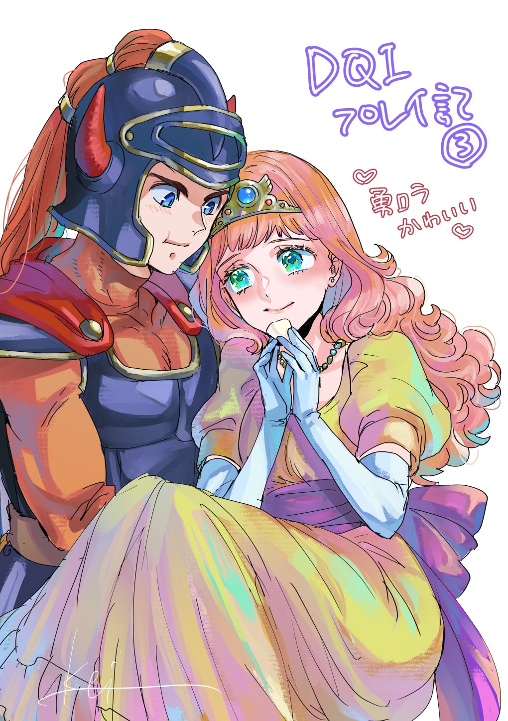 1boy1girlback bowblue eyesblue helmetbodysuitbowcapecarryingclosed mouthdresselbow glovesfake hornsglovesgreen eyeshearthelmethorned helmethornsjewelrylong hairlooking at anothernecklaceorange bodysuitorange hairprincess carrypuffy short sleevespuffy sleevespurple bowpurple sashred capesashshort sleevessimple backgroundtiarawhite backgroundwhite glovesyellow dress