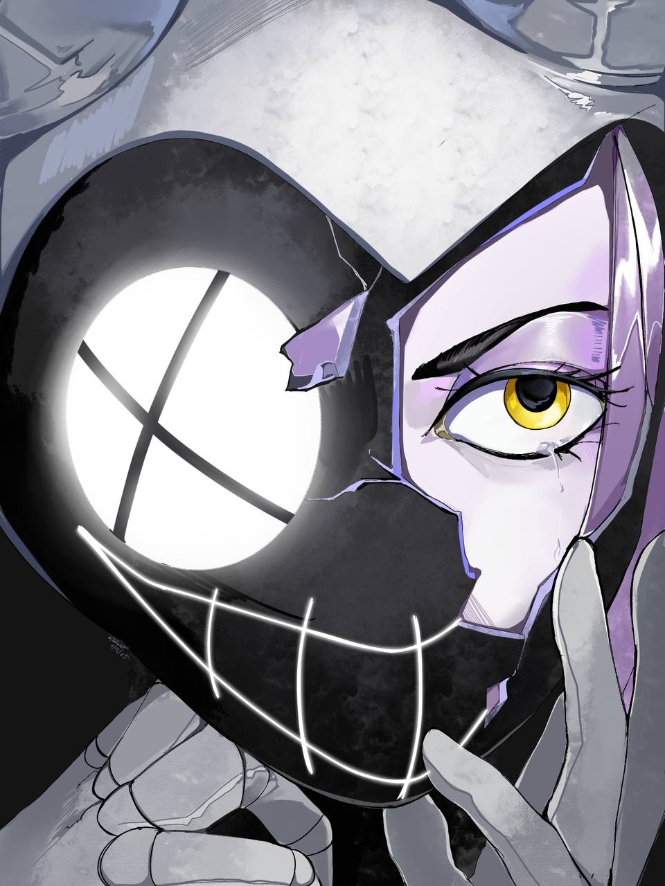 1girlcracked kawaii maskglowingglowing eyegrey hairhands uphornsmasknitolatapale skinsolotearsyellow eyes