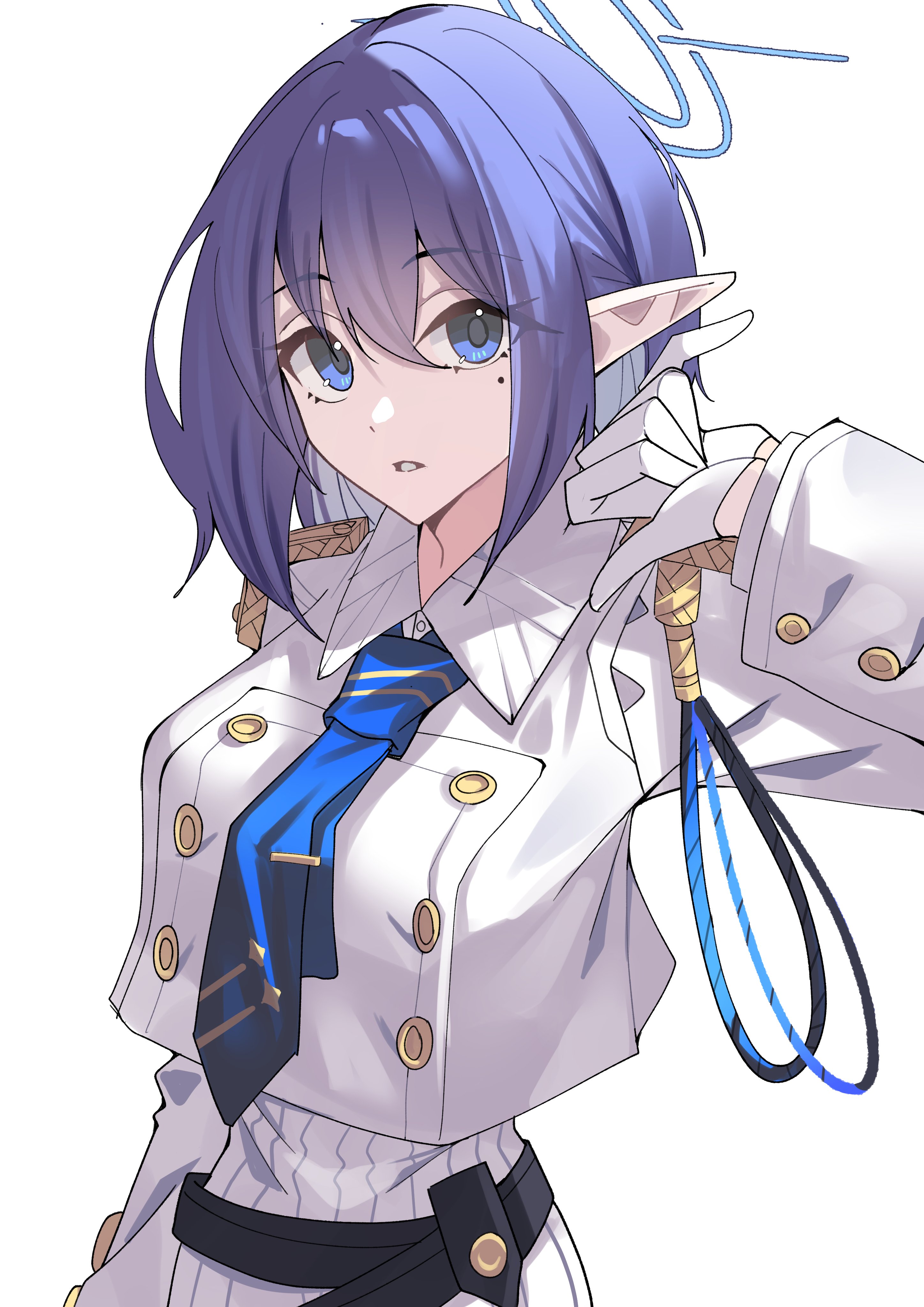 1girlblue eyesblue haloblue necktiebreastsbuttonscollared shirtcropped jacketdouble-breastedgloveshalohand upjacketlarge breastslong sleevesmedium hairmolemole under eyenecktieparted lipspointy earspurple hairshirtsimple backgroundsoloupper bodywhite backgroundwhite gloveswhite jacketwhite shirt