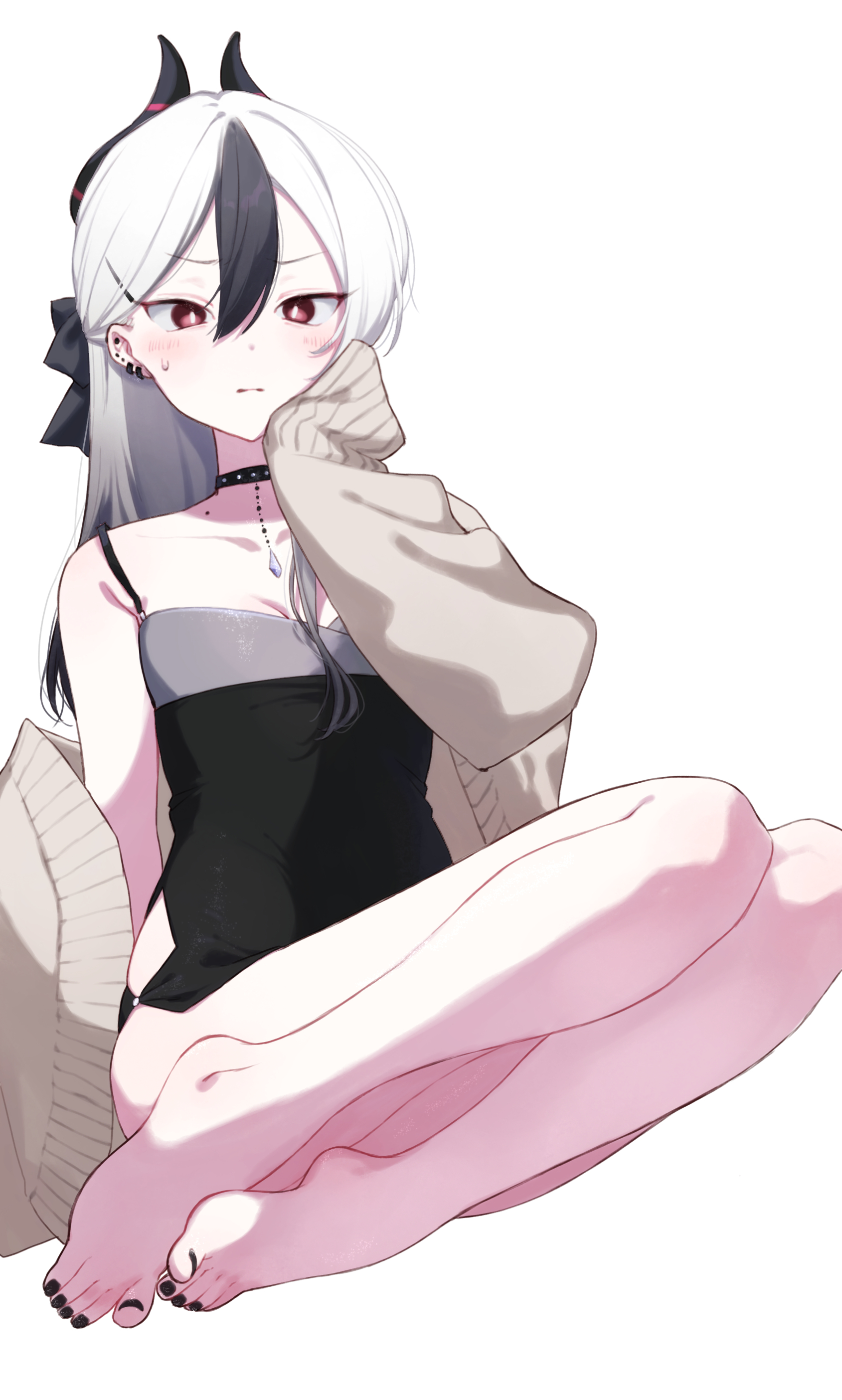1girlbare legsbare shouldersbarefootblack chokerblack dressblack hairblack hornsblack nailsblack ribbonblushbreastsbright pupilscardiganchokerclosed mouthcoat partially removeddemon girldemon hornsdiamond necklacedouble-parted bangsdressear piercingfeetfull bodygradient hairgrey hairgrey halogrey sweaterhair ribbonhalf updohalohand on own chinhand uphornslegslegs togetherlong hairlong sleeveslooking at viewermedium breastsmolemole on neckmulticolored hairnail polishofficial alternate costumeofficial alternate hairstyleopen cardiganopen clothespiercingred eyesribbonsimple backgroundsittingsleeves past fingerssleeves past wristssmall breastssolosweatdropsweatertoenail polishtoenailstoestsurimetwo-tone hairv-shaped eyebrowswhite backgroundwhite pupilsyokozuwari