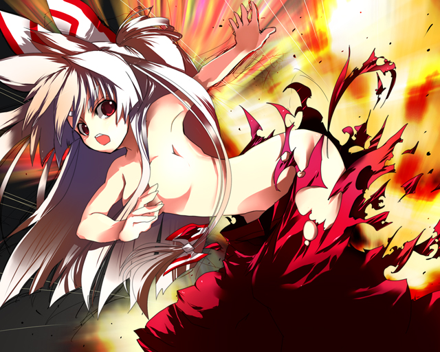 1girlarmpitsassbreastscensoredconvenient censoringfemale focusfiregradient backgroundhair ribbonlong hairmedium breastsribbonsolotorn clothes