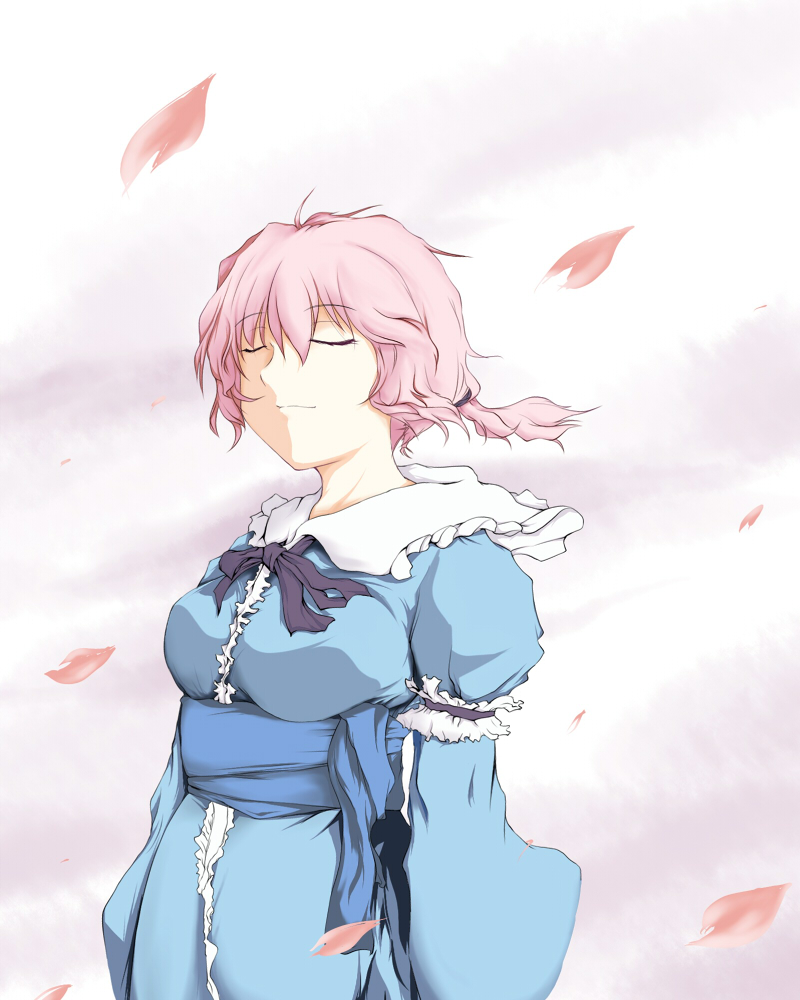 1girlbreastsclosed eyesdressfemale focusgradient backgroundjapanese clotheskimonopink hairshort hairsolowhite background