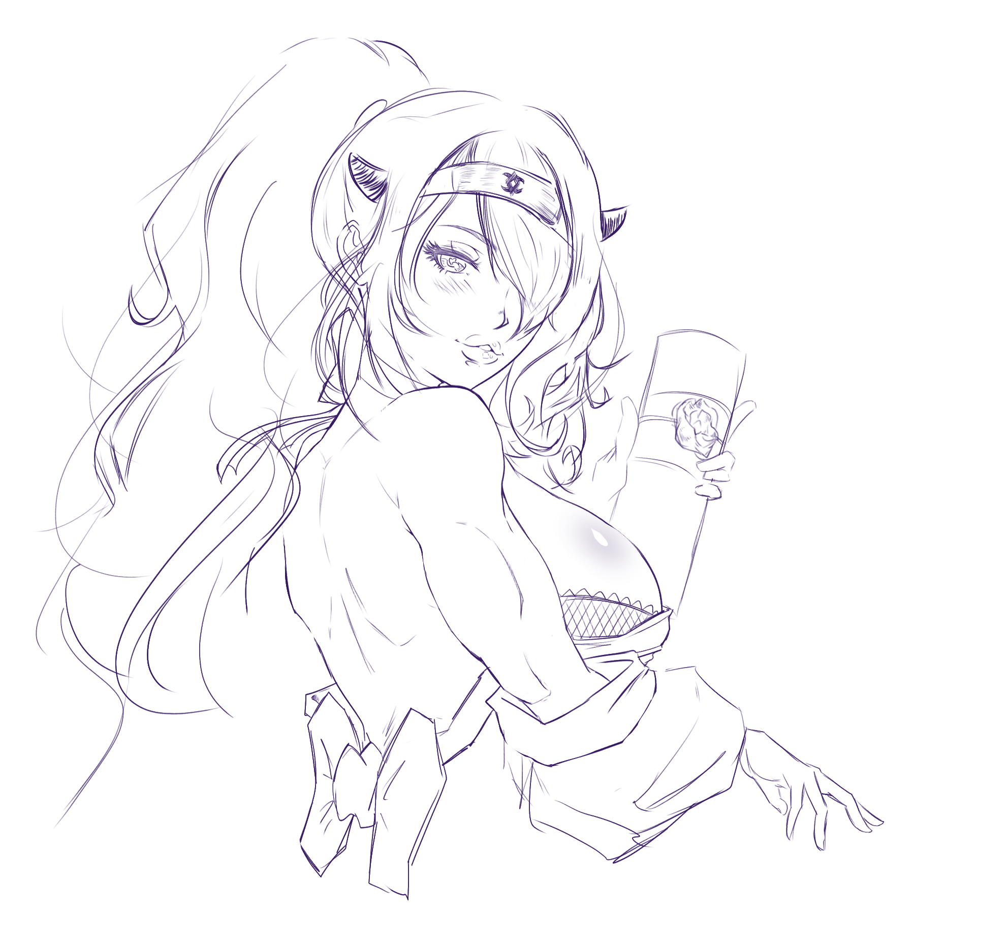 bare backbare shouldersblushbreastshachimakihair over one eyeheadbandheartheart-shaped pupilsjapanese clotheskimonolarge breastslooking at viewerlooking backninjaofficial alternate costumeone eye coveredponytailscrollsideboobsketchsymbol-shaped pupilstonedtoned female