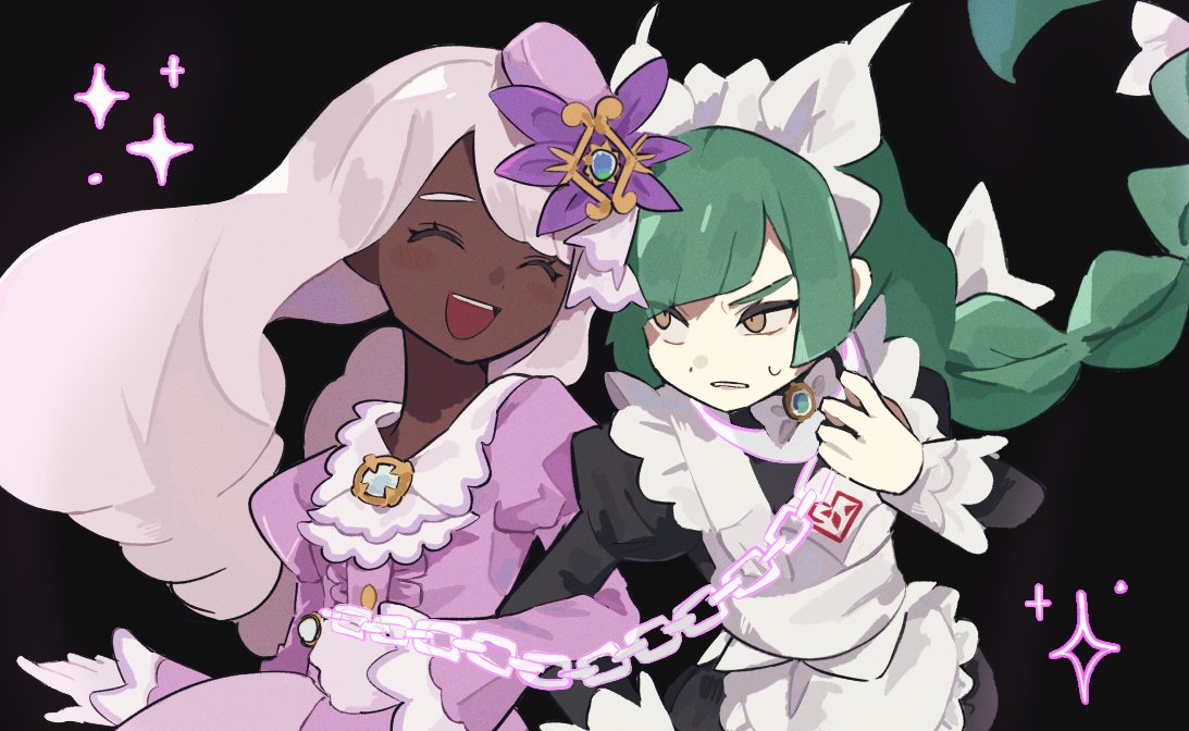 1boy2girlsapronascotblack backgroundblack romperbowbowtiebraidbraided ponytailcenter frillschainchain leashclosed eyescollardark skindark-skinned femaledressfascinatorfrilled ascotfrillsfrownglovesgreen hairhair ornamenthand upholdingholding chainholding leashjuliet sleevesleashlong braidlong hairlong sleeveslooking at viewerlow drillsmaidmaid apronmaid headdressmega stonemultiple girlsopen mouthparted lipspet playpuffy sleevespurple dresspurple eyesrompersingle braidsmilesparkleteethupper bodyupper teeth onlyv-shaped eyebrowsvery dark skinvery long hairwhite bowwhite bowtiewhite gloves