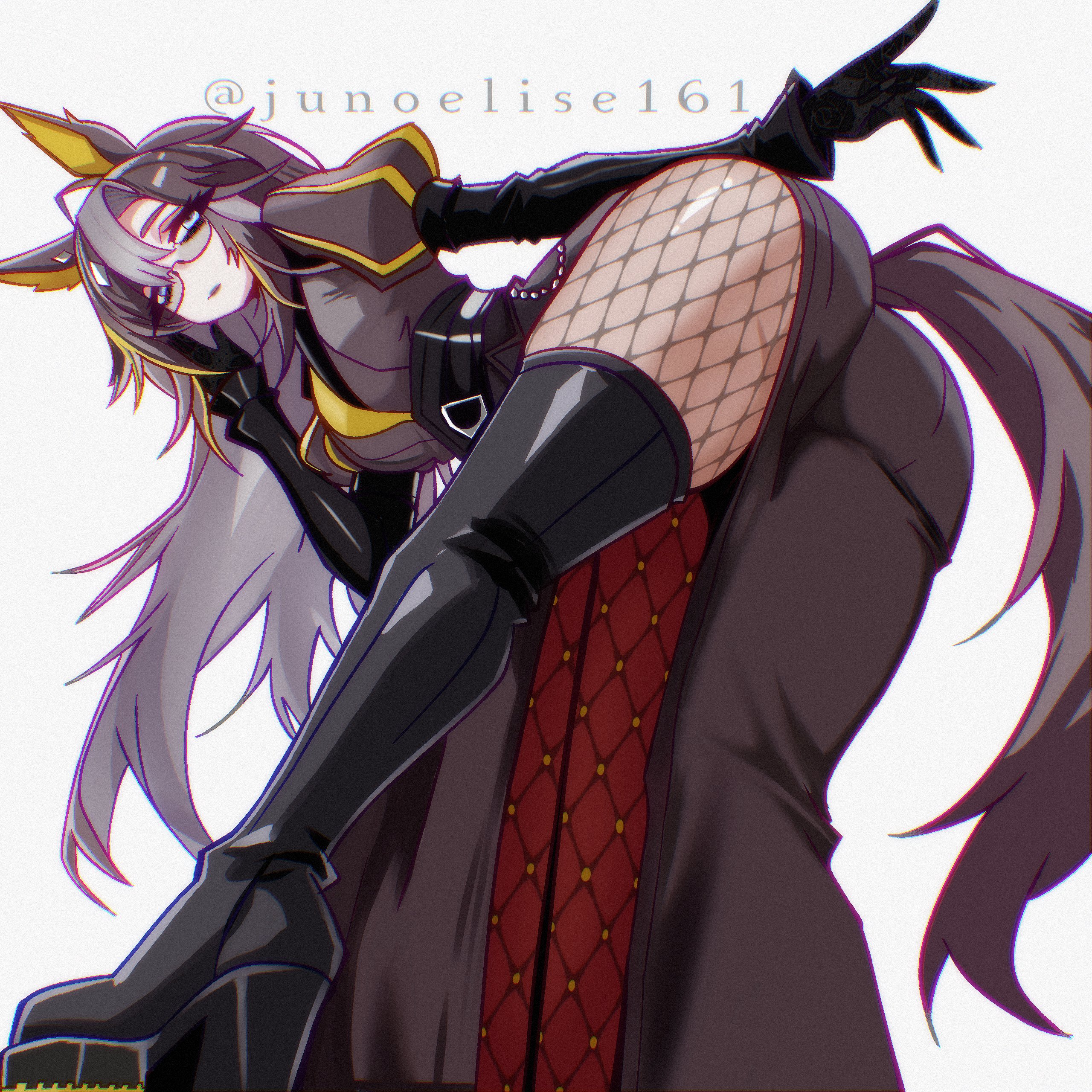 1girlahogeanimal earsassbent overblack bootsblack glovesblack hairblue eyesbootscoatfishnet pantyhosefishnetsglassesgloveshair between eyeshorse earshorse girlhorse taillong hairlong sleeveslooking at viewermulticolored hairpantyhoseplatform bootspuffy sleevesshirtsimple backgroundsolotailthigh bootswhite hair