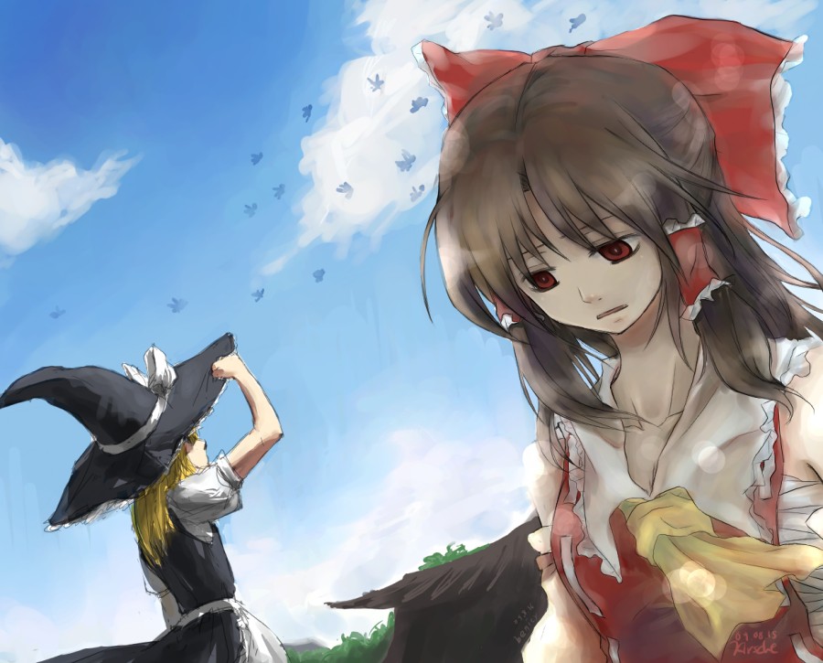 2girlsblonde hairblue skybowbraidbrown hairclouddaydetached sleevesfemale focushair bowhair tubeshatlong hairmultiple girlsribbonshort hairskywitch hat