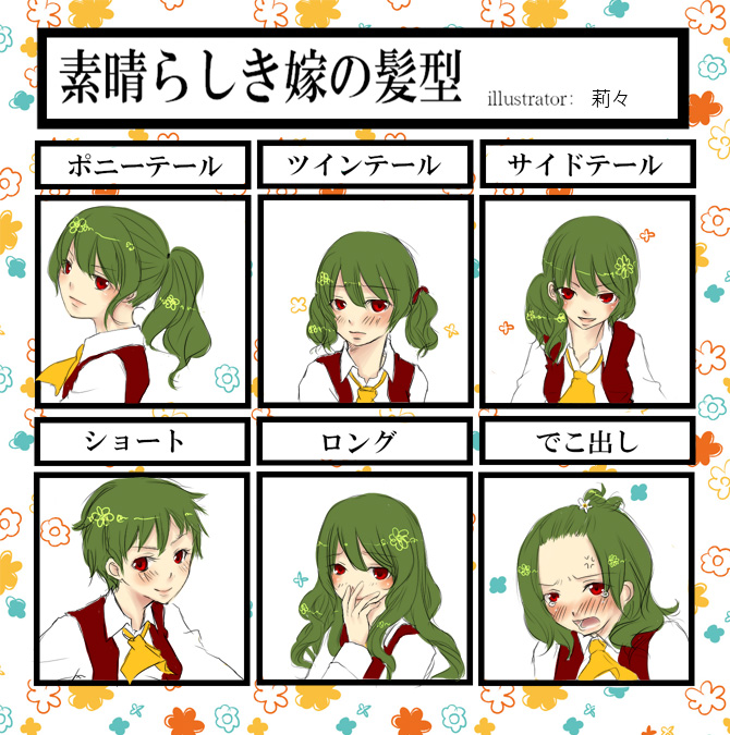 1girlalternate hair lengthalternate hairstyleascotblushchartfemale focusgreen hairlong hairmultiple viewsponytailred eyesshort hairside ponytailtwintailsvest