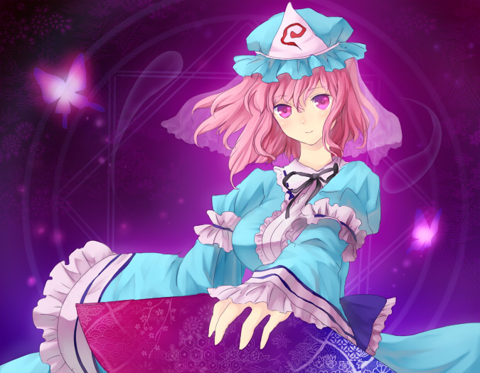 1girlblue dressbugbutterflydressfemale focusfolding fanfrillshand fanhatjapanese clotheslong sleeveslooking at viewermob cappink eyespink hairshort hairsolotriangular headpieceupper bodywide sleeves