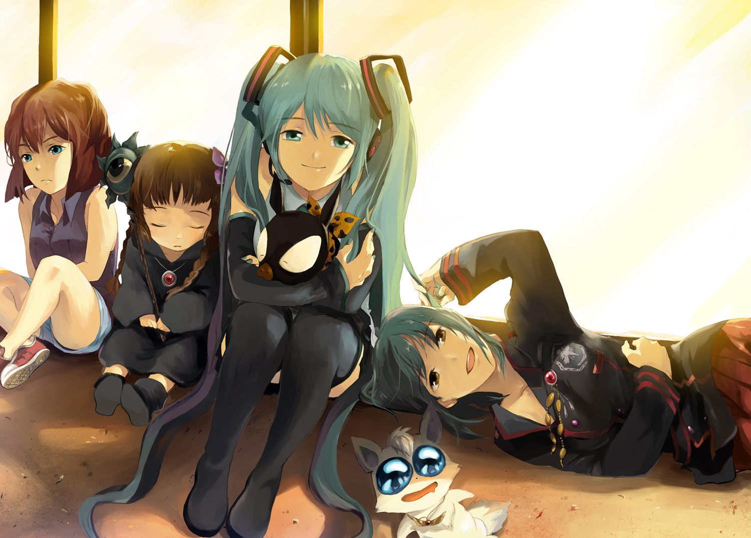 00s1990s (style)4girlscrossoverdetached sleevesgreen eyesgreen hairlong hairmultiple girlsnecktieretro artstyleskirtsmilethighhighstwintailsvery long hair